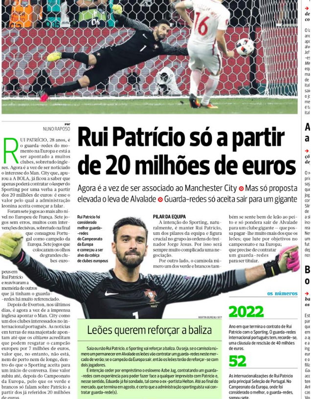 Just like Sporting want to keep him, Patrício wants to stay as well. But if he’s going to leave, A Bola says he has a few conditions to accept it: The new club needs to be a giant one, who can pay him much more than Sporting.