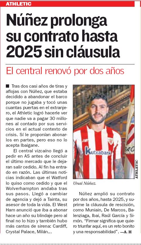 Athletic Bilbao confirmed on Tuesday the centre-back has signed a new contract at the club and his current deal will not include a buyout clause.