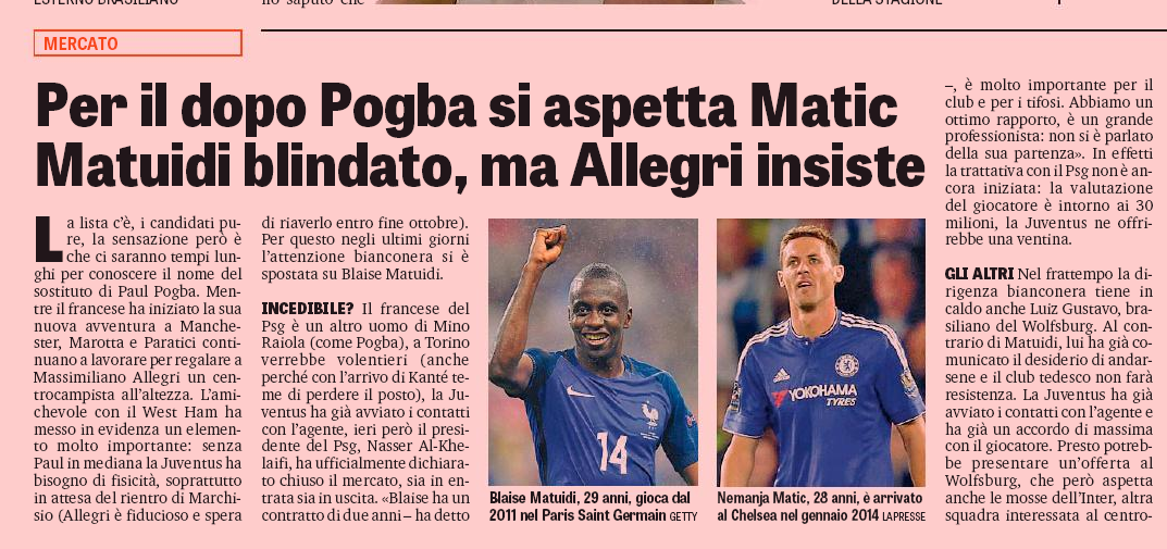 Italian newspapers moved on from Paul Pogba well over a week ago, and the concentration turned to who will take over from the Frenchman at Juventus.