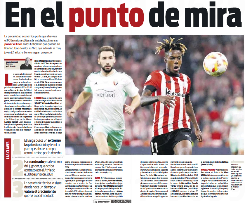 Aston Villa are one of the clubs in the picture to sign Athletic Club star Nico Williams, according to Sport.
