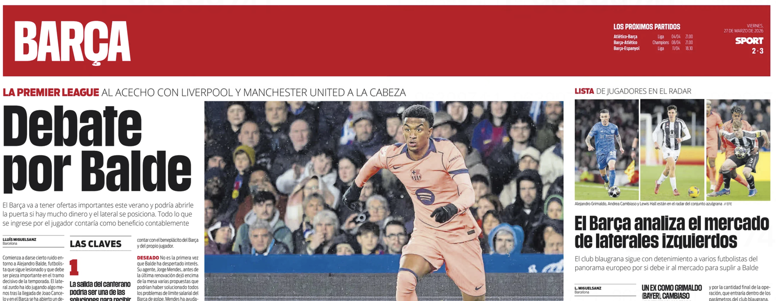 Hansi Flick has Alejandro Balde and Gerard Martín as the two left-backs at the Camp Nou and the duo could leave after this season. On Thursday, Sport Witness relayed news of Manchester United, Manchester City and Aston Villa making initial contact for Balde.