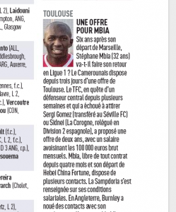 Sampdoria, who are also interested, have asked about his wage requirements, while Ligue 1 side Toulouse made an offer to Mbia three days ago.