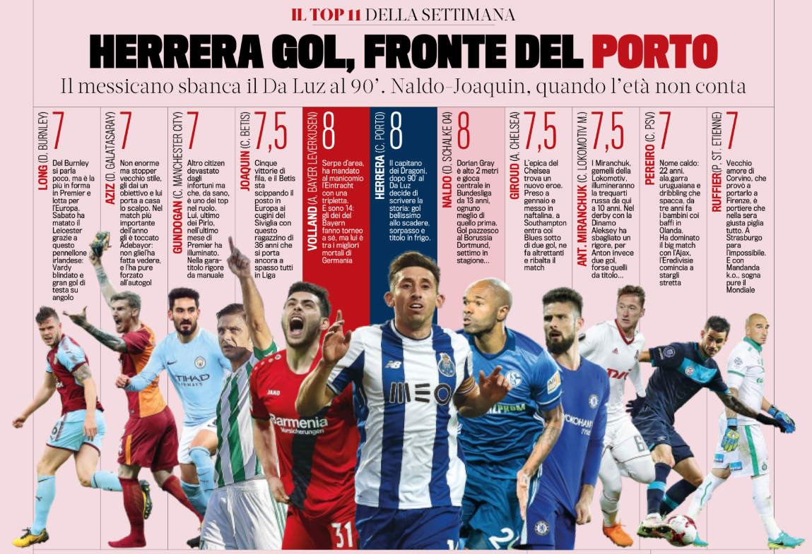 The grand old Italian newspaper pick out a selection every week, whilst ignoring their own Serie A. There’s usually some English interest, with Tuesday’s selection having players from Burnley, Manchester City and Chelsea.