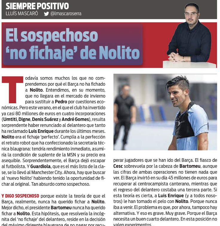 Barcelona had wanted to sign Nolito during the winter transfer window, but were faced with money difficulties. That hasn’t been the same situation this summer, and Sport say it’s ‘absurd’ that Barcelona stood back and allowed the player to join Manchester City.
