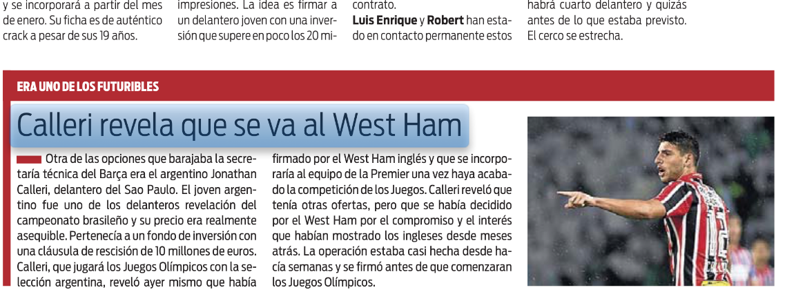 But, once again, hesitation seems to have allowed a Premier League club to come in and get the business done. Catalan newspaper Sport on Tuesday cover Calleri’s comments that he’s signing for West Ham Untied, with Sport feeling the Hammers effort to get the player was crucial, and helped make up his decision.