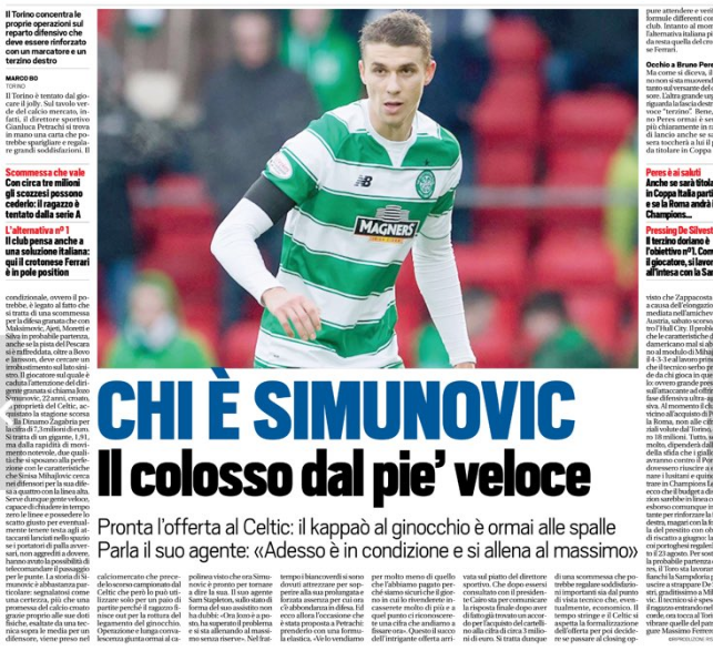 Torino are reportedly interested in Celtic defender Jozo Šimunović, with a Turin newspaper having a huge article on the subject in their Thursday edition.
