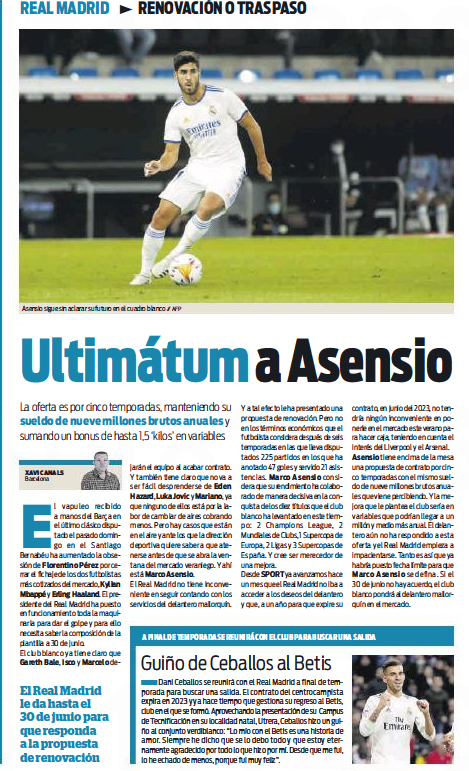 The newspaper explains Real Madrid have set a deadline of June 30th for Asensio to accept their offer and if not, he will be made available for sale in the summer.