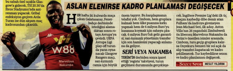 Turkish newspaper Sozcu report Galatasaray remain keen on signing Aston Villa defender Marvelous Nakamba as they still want to sign a central midfielder before the transfer window closes.