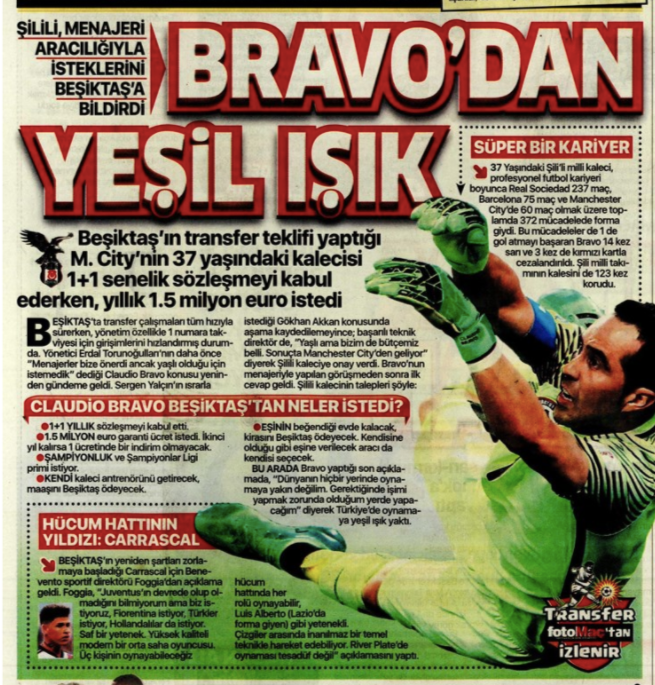 Bravo’s contract at Manchester City will expire at the end of the season, and reports in the Turkish press say he’s a target for the Black Eagles. Arsenal are also said to be interested in his services, according to various reports.