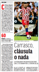 Los Rojiblancos have denied having any negotiations with Spurs for Carrasco and they don’t contemplate his exit in the last day of the window.