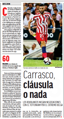 Although his exit is not contemplated at Atlético, Marca explain ‘there is the possibility that Tottenham pay the €60m’ for Carrasco.