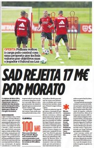 Correio da Manhã writes that despite claims of Morato forcing his way out, that’s not true and the player won’t put any pressure on Benfica, as he’d rather leave on good terms.