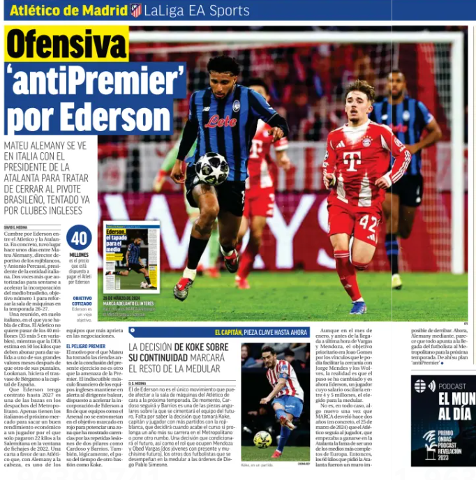That’s according to Wednesday’s edition of Marca, who mention Arsenal in a report on Los Rojiblancos. Their title states: ‘Atlético Madrid’s ‘Anti-Premier League’ Offensive for Éderson’.