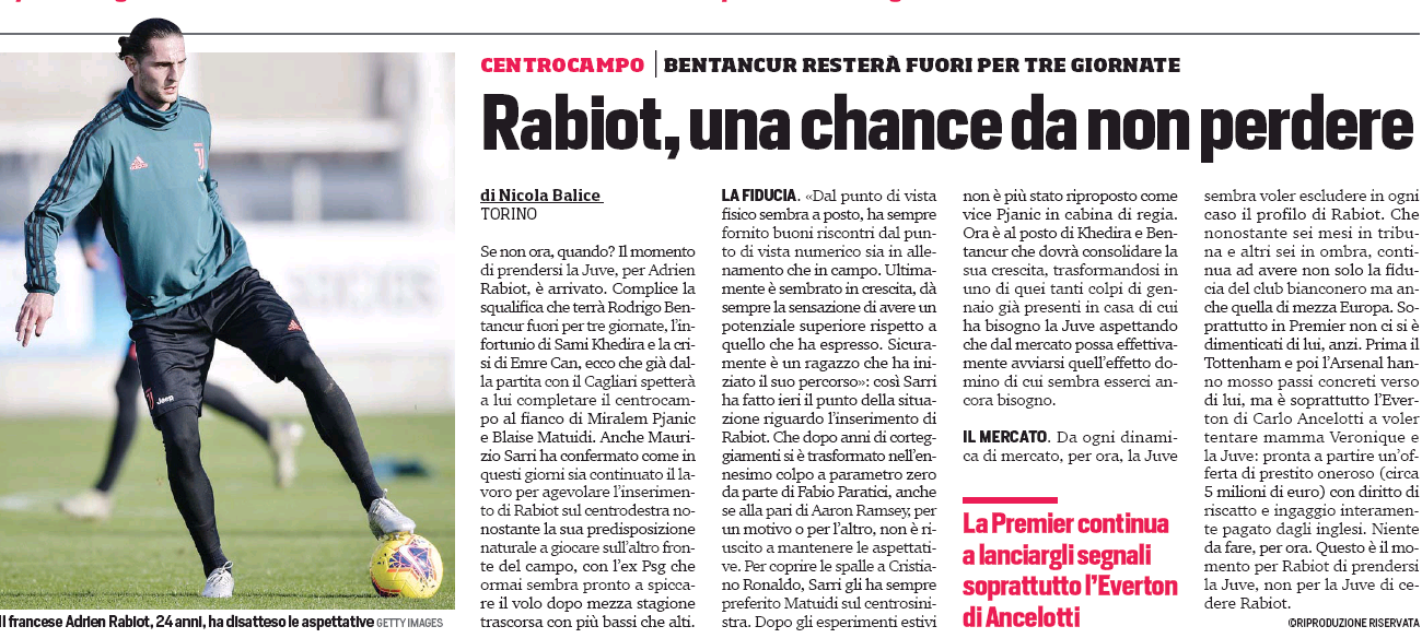 Ahead of the Christmas break, Adrien Rabiot had been gaining some prominence at Juventus and he’s expected to start the match against Cagliari this afternoon as Serie A sides return to action.
