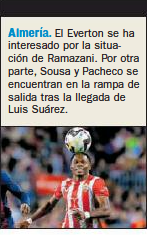 Everton ‘have been interested’ in signing UD Almería’s Largie Ramazani in January, as per Monday’s AS.
