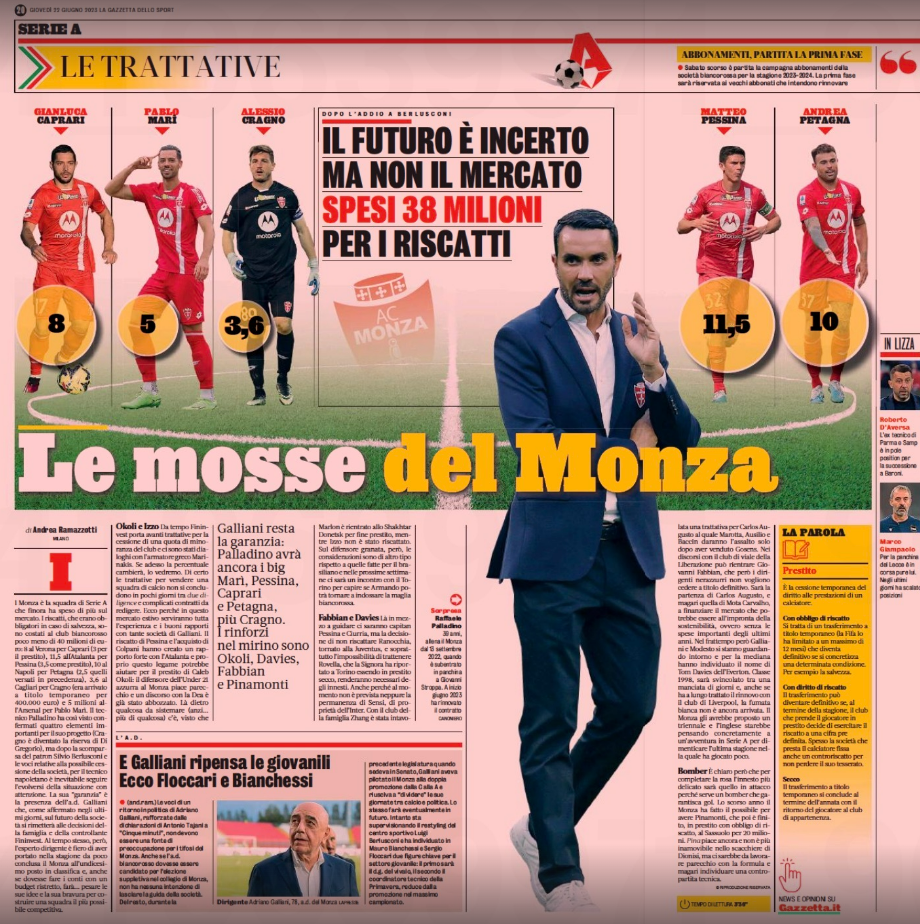 The newspaper reports that Monza CEO Adriano Galliani and technical director François Modesto are looking around at potential reinforcements for the squad this summer.