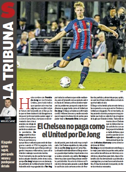 Barcelona had a meeting with the midfielder in the United States to unblock his situation, even though they are aware he wants to continue with them. If De Jong were to stay, it is not clear whether or not he will accept another pay cut.