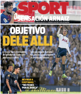 Monday’s edition of Sport has Dele Alli and a potential move to Barcelona on their front page. A Catalan newspaper, Sport would like nothing more than for Tottenham to thrash Real Madrid home & away and send the Spanish champions into turmoil.