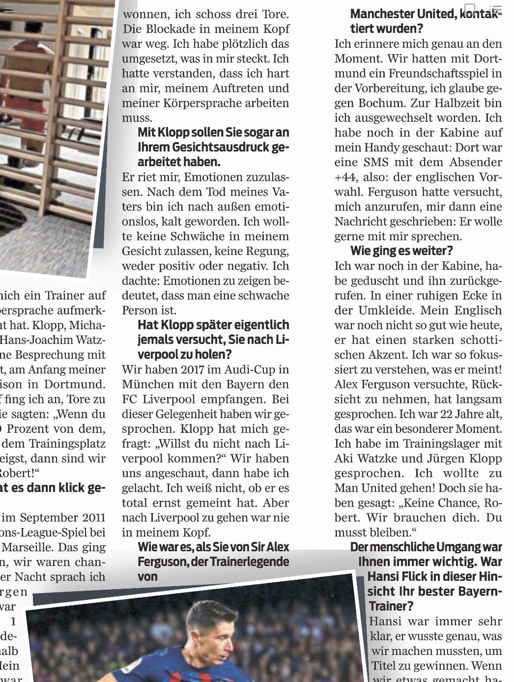 “I was still in the dressing room, I took a shower and called him back, in a quiet corner. My English wasn’t as good as it is today. He has a strong Scottish accent. I was so focused on understanding what he meant! Alex Ferguson tried to be considerate, spoke slowly. I was 22 years old, it was a special moment. I spoke to Aki Watzke and Jürgen Klopp in the camp. I wanted to go to Man United! But they said: ‘No chance, Robert. We need you. You have to stay.”