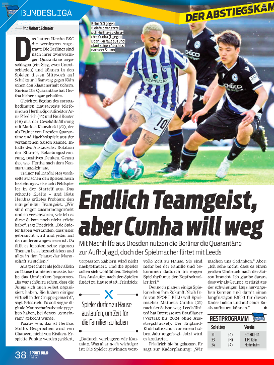 Cunha has had a relatively impressive campaign for Hertha despite their struggles in the Bundesliga, with seven goals and six assists in 27 league games so far.