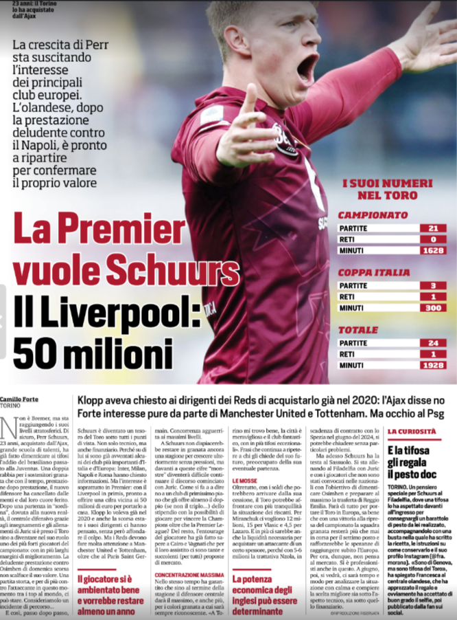 Liverpool are interested in Torino defender Per Schuurs and are ‘at the forefront’ of clubs looking to sign him this summer, working to beat Manchester United and Tottenham Hotspur.