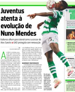 The race for Sporting fullback Nuno Mendes is highlighted by Portuguese newspaper A Bola today.