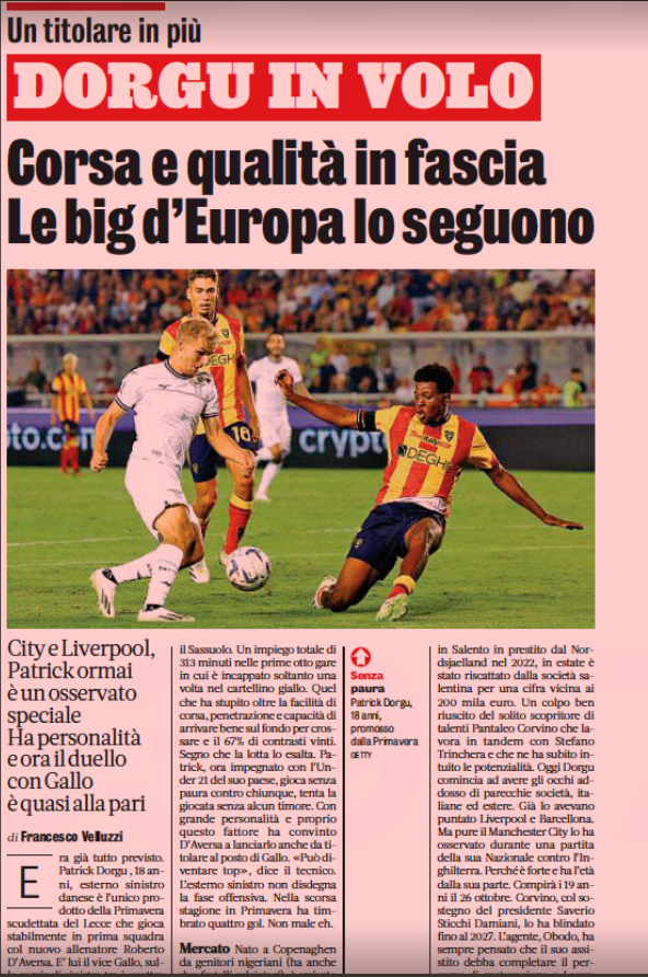 Liverpool and Manchester City are showing an interest in Lecce full-back Patrick Dorgu but could face competition from Barcelona for his signature.