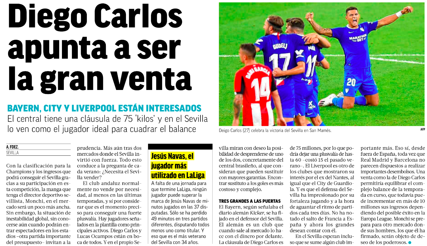 Sevilla are keen to sell defender Diego Carlos this summer, with Liverpool and Manchester City both in the race for his signature.