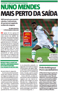 The newspaper highlights the fact that Nuno Mendes could be used in the deal for Pedro Porro, who’s loaned to Sporting by Manchester City until 2022.