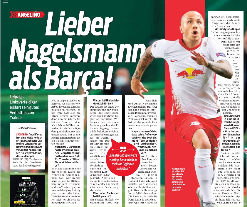 “It’s great that one of the biggest clubs in the world wanted me. But in my mind it was always clear: I want to go to RB Leipzig and not to another club, no matter which club that was,” Angeliño told SportBild when asked about Barca’s interest.