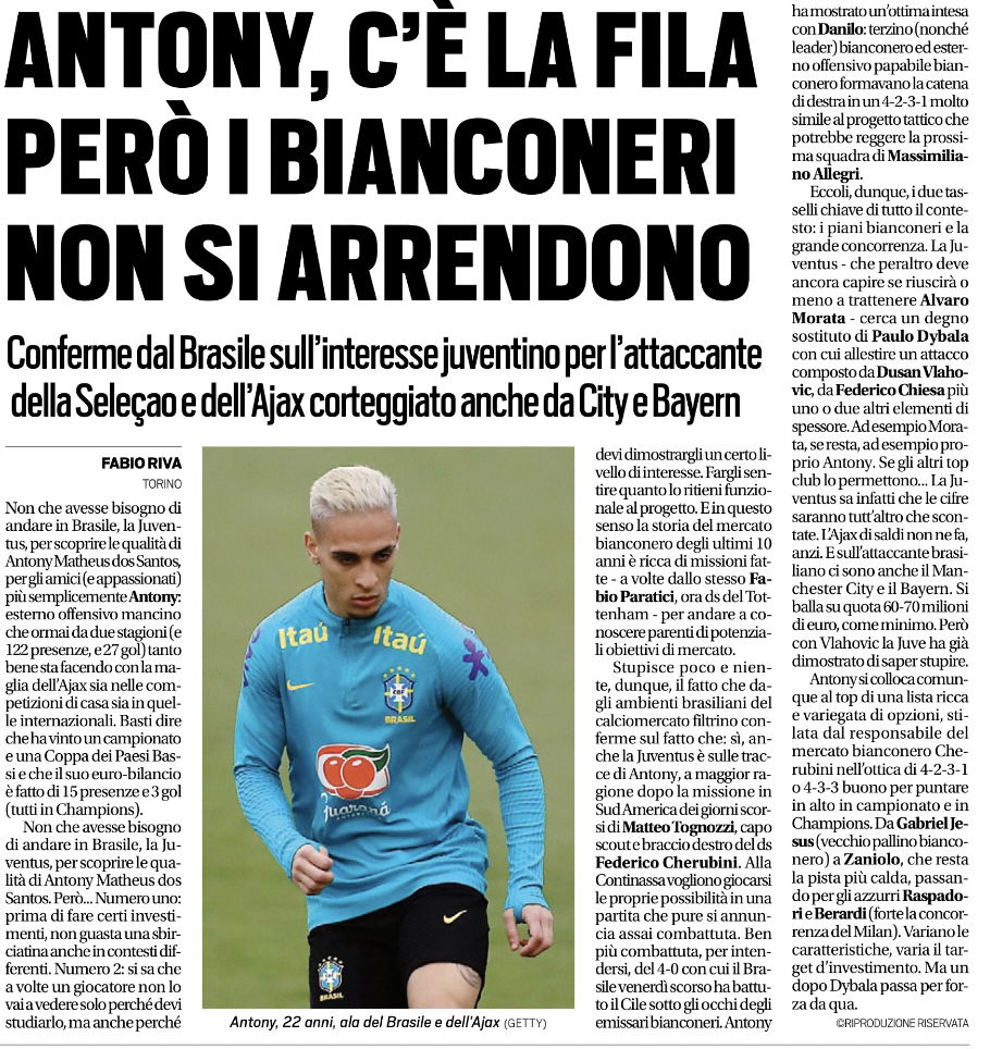 The Italian newspaper name the Premier League leaders as one of the clubs looking at Ajax Amsterdam’s Antony, who boasts 12 goals and 10 assists in 33 appearances this season for the Eredivisie side.