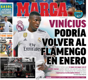 The front page of Thursday’s Marca presents a worry for Real Madrid and the club’s fans: There’s a chance Vinicius could return to Brazil with former club Flamengo in the January transfer window.