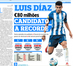The whole point of the report is to insist Luiz Diaz is now a serious candidate to break Porto’s transfer record, currently held by Eder Militao and his €50m move to Real Madrid in 2019, and that he’s not beyond the reach of some.