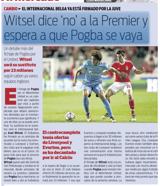 Sport claim that Witsel has chosen Juventus, and already communicated this decision to Liverpool and Everton. The Belgian preferred to play football in Italy, and seems to have finally found a club willing to pay both his fee and his high wages.