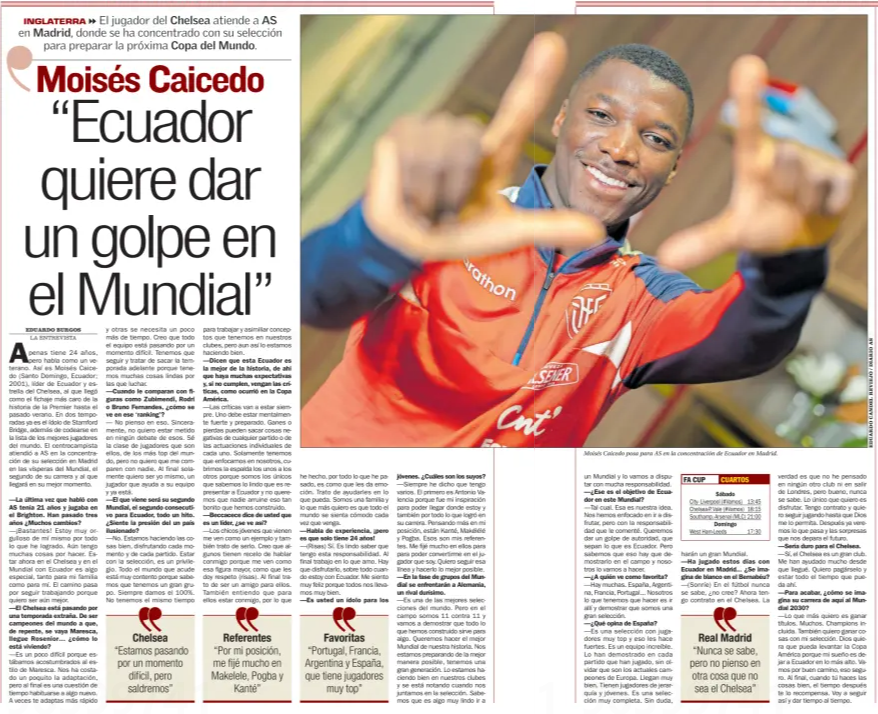 Friday’s edition of AS have published a detailed interview with Moisés Caicedo to discuss his growth, Chelsea, the future and the upcomingWorld Cup with Ecuador.