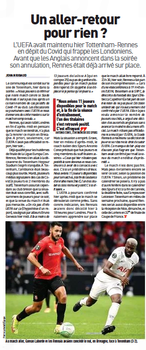L’Equipe explain UEFA stated yesterday that the fixture will take place despite the number of positive cases at Tottenham. Therefore, Rennes travelled to London, before the Premier League club decided to cancel the tie.