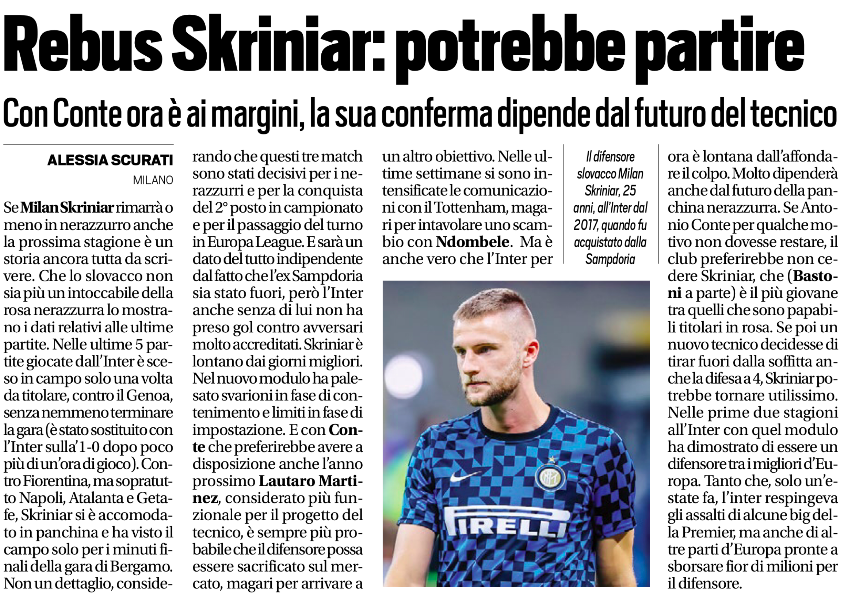 Much will also depend on Conte’s future. Should he leave then Inter would prefer not to lose Škriniar as he’s a player that could become ‘very useful’ under a new coach.