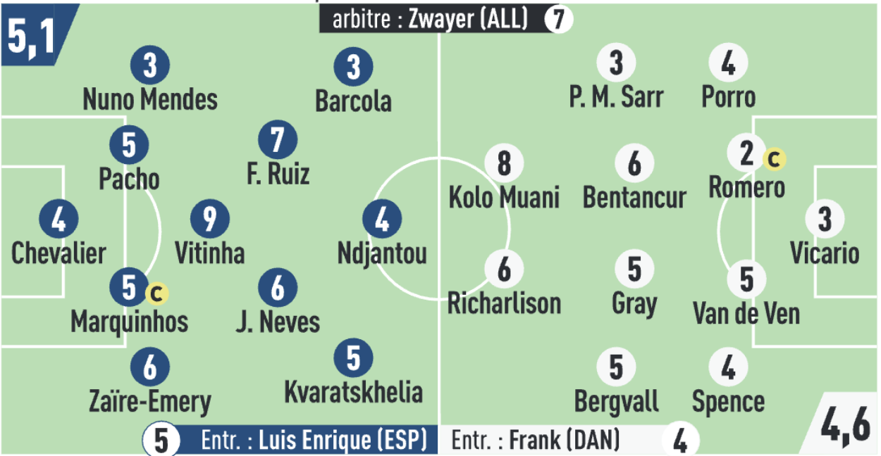 Kolo Muani scored in the 50th minute to see Tottenham regain their lead. Vitinha scored the second goal of the match three minutes later.