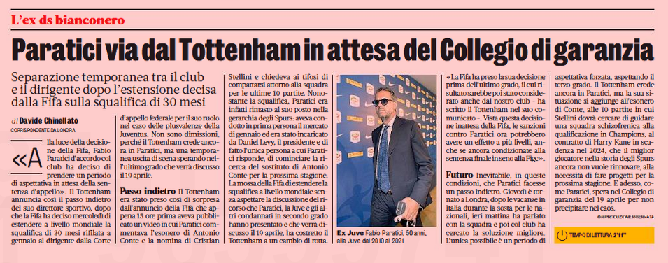 Gazzetta say that despite being banned in Italy, Paratici had ‘personally led’ the January transfer window and been instructed by Daniel Levy to begin the search for Conte’s replacement for next season.