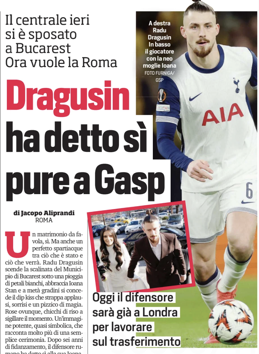 Today’s Corriere dello Sport explains Dragusin got married in Bucharest on Tuesday. He sees this as a new period of his life which he can also start with a switch to Roma.