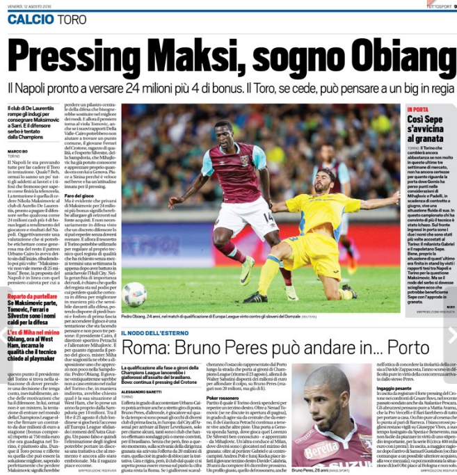 But Obiang would only be a reality for Torino in case they really sell Nikola Maksimovic. They would use the money from the defender’s sale to invest in the midfielder.